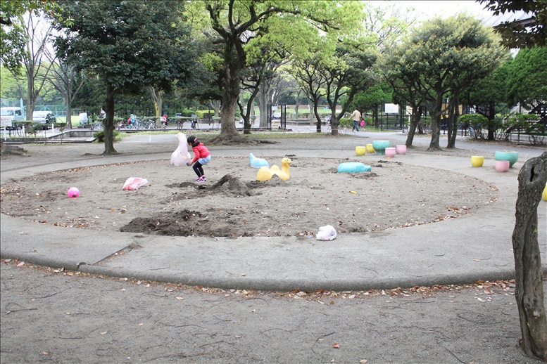 補助輪付き自転車のサイクリングコースの中央に小さな幼児も遊べるラクガキ広場があります。