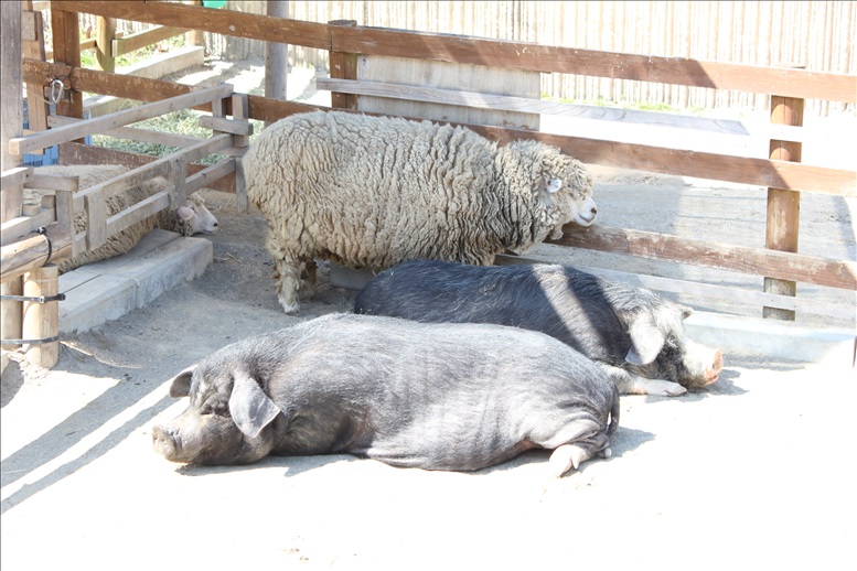 ミニブタとひつじが同じ柵の中で