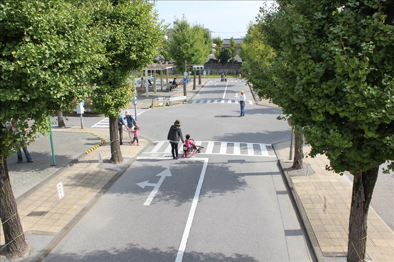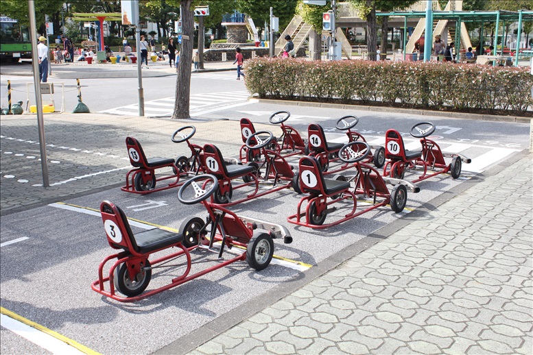 自転車やゴーカート(足漕ぎ式)を借りて、信号や横断歩道がある公園内の道路を交通ルールを守りながら走って楽しむことができます。