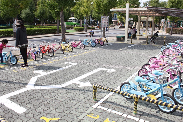 自転車には、補助輪付き、補助輪なしが用意されていて、色も赤、青、ピンク、黄色、水色と自転車置き場はカラフルです。