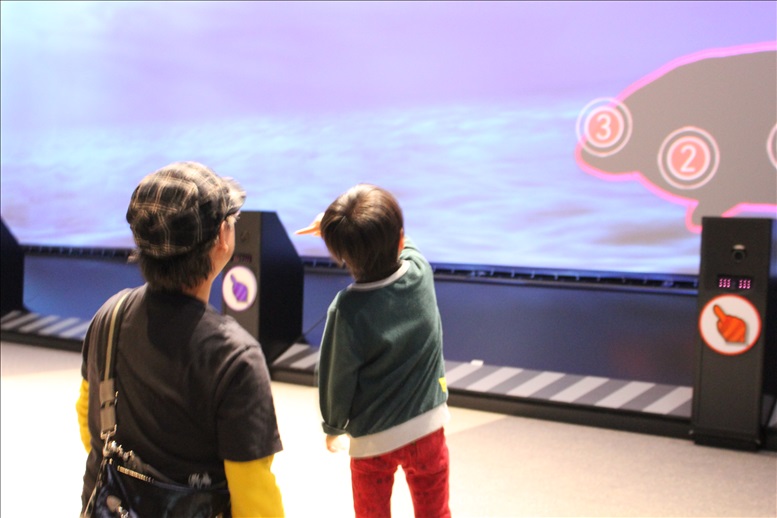 床にも映像が流れるので、息子のペン太は興味深々で足元の映像を眺めてました。