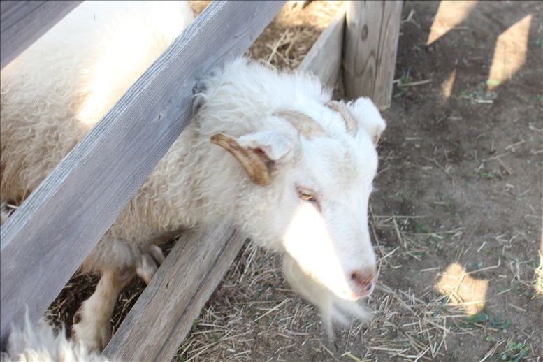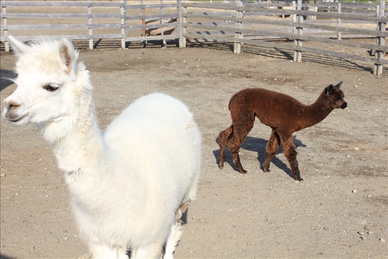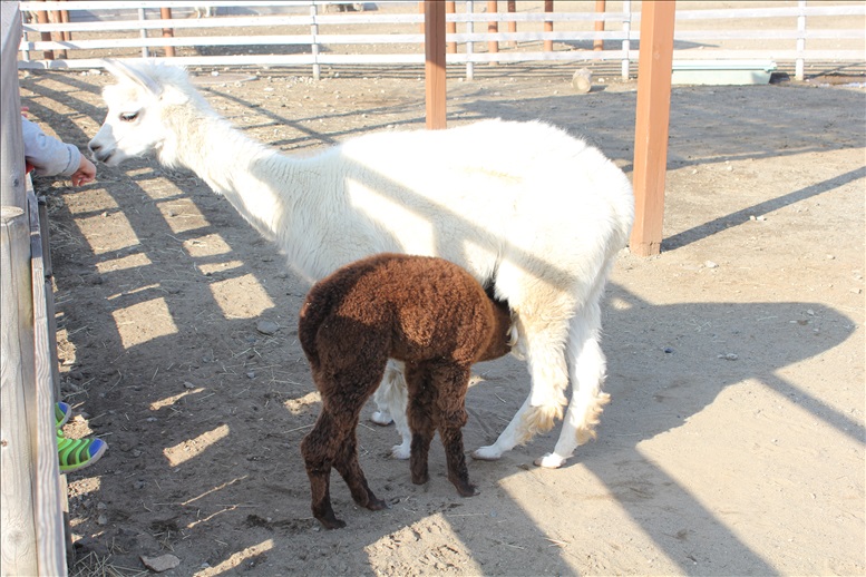 子供たちに人気のアルパカ。茶色いアルパカは白いアルパカの子供です。