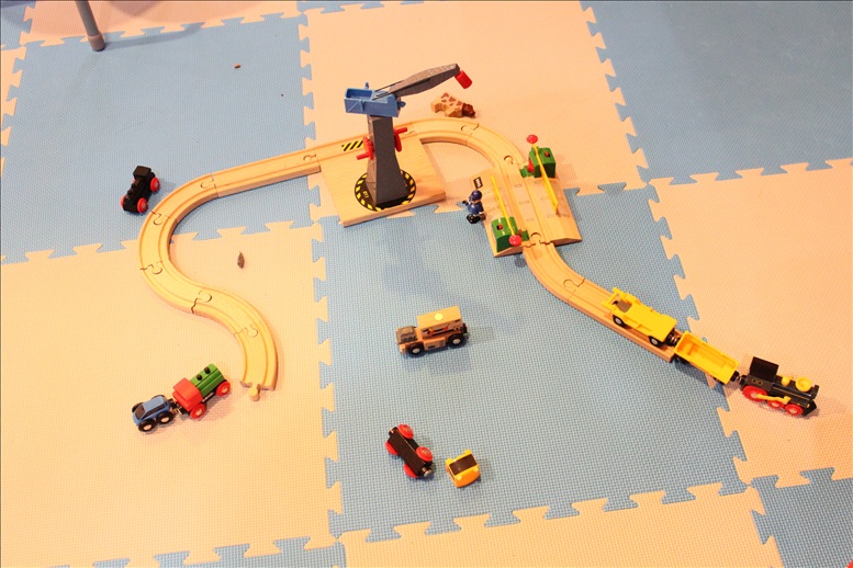 木の列車の玩具や、おママゴト用の玩具があります。