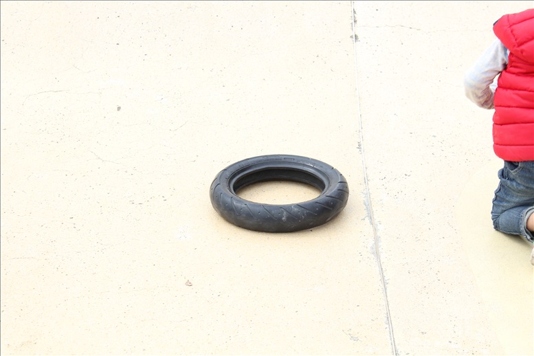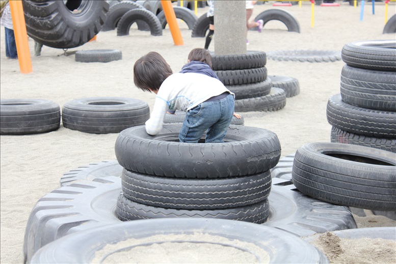 積み上げられたタイヤの中に入ってみたり、またかくれんぼに利用したり、タイヤの上をケンケンパしたり、タイヤを平均台の様に使ったりと子供達が様々なかたちで遊びを見つけていました。