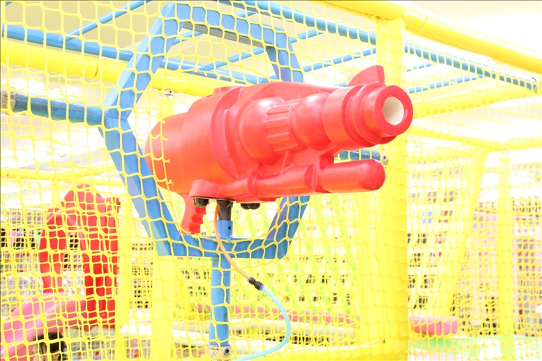 黄色い網に囲まれたジャングルジム内には、ボールプール、滑り台、プチアスレチックなどが楽しめる人気のコーナーです。